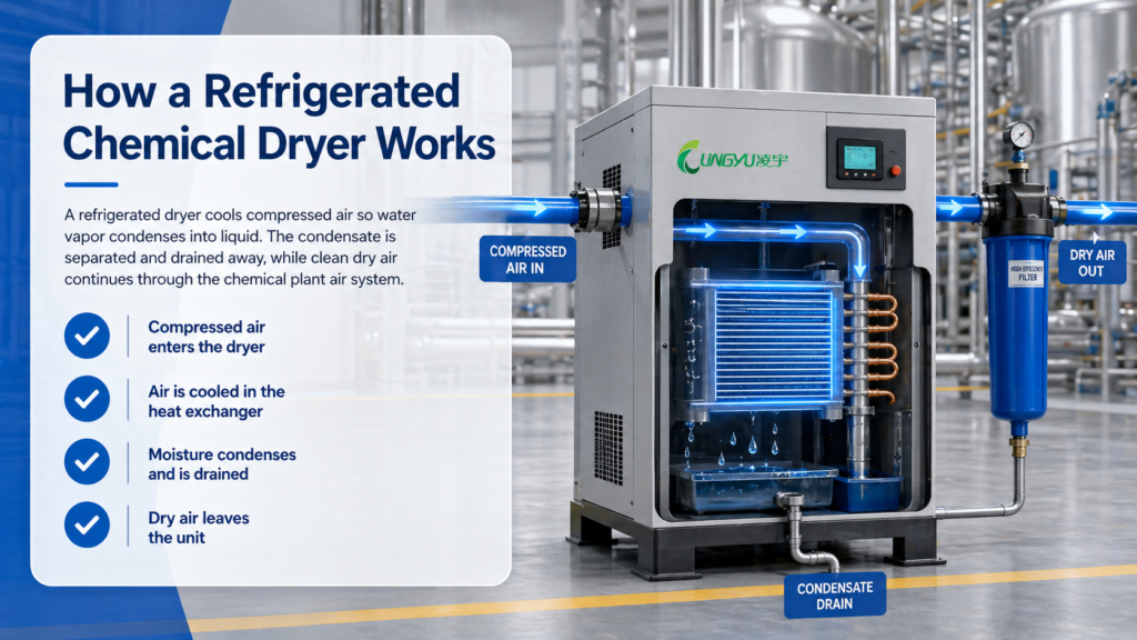 When ambient air is compressed, the concentration of water vapor increases. As the air cools, the vapor condenses into liquid water. If this moisture is not removed, it can enter pipelines, instruments, pneumatic equipment, and sensitive production areas. A chemical dryer solves this problem by lowering the dew point of the compressed air before it reaches downstream equipment.