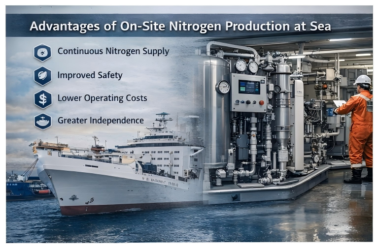 Installing a nitrogen generator on board offers several important advantages compared with traditional nitrogen supply methods.