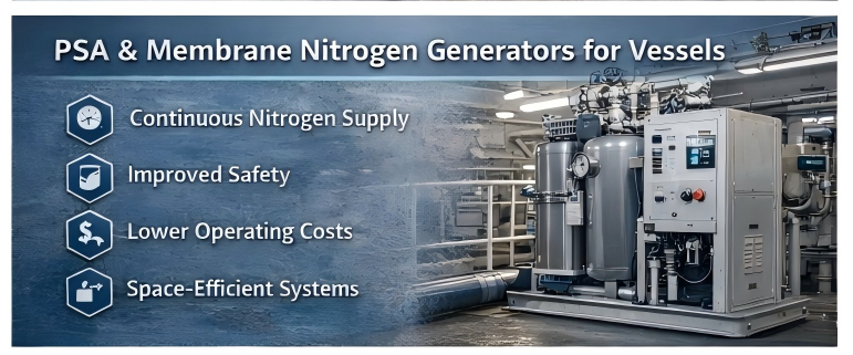 Nitrogen is widely used on board for tank inerting, fire prevention, pipeline purging, pressure maintenance, and protection of sensitive equipment or stored materials. Traditionally, nitrogen could be supplied through cylinders or liquid nitrogen deliveries, but these methods are often less practical in marine environments due to storage limitations, supply dependence, and operational inconvenience.