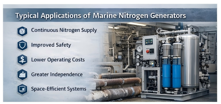 Marine systems are usually designed with compact layouts in mind. Modern nitrogen generators can be integrated into vessel systems efficiently, making better use of limited onboard space than large quantities of stored gas.