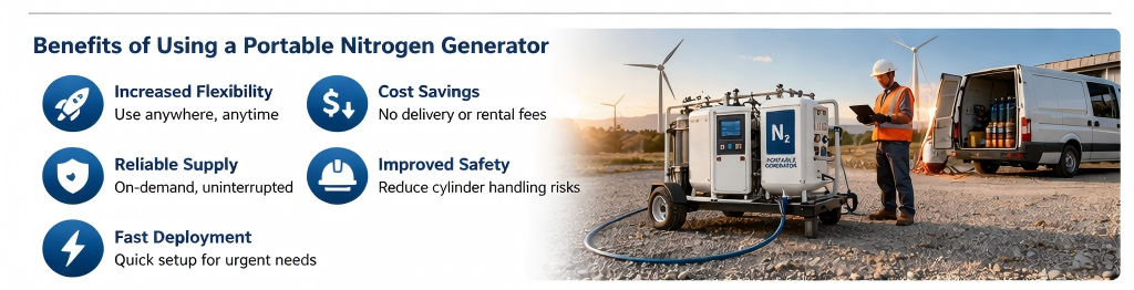 A portable nitrogen generator produces nitrogen directly on-site, eliminating the need to store large quantities of bottled gas. This improves supply security and reduces handling risks.