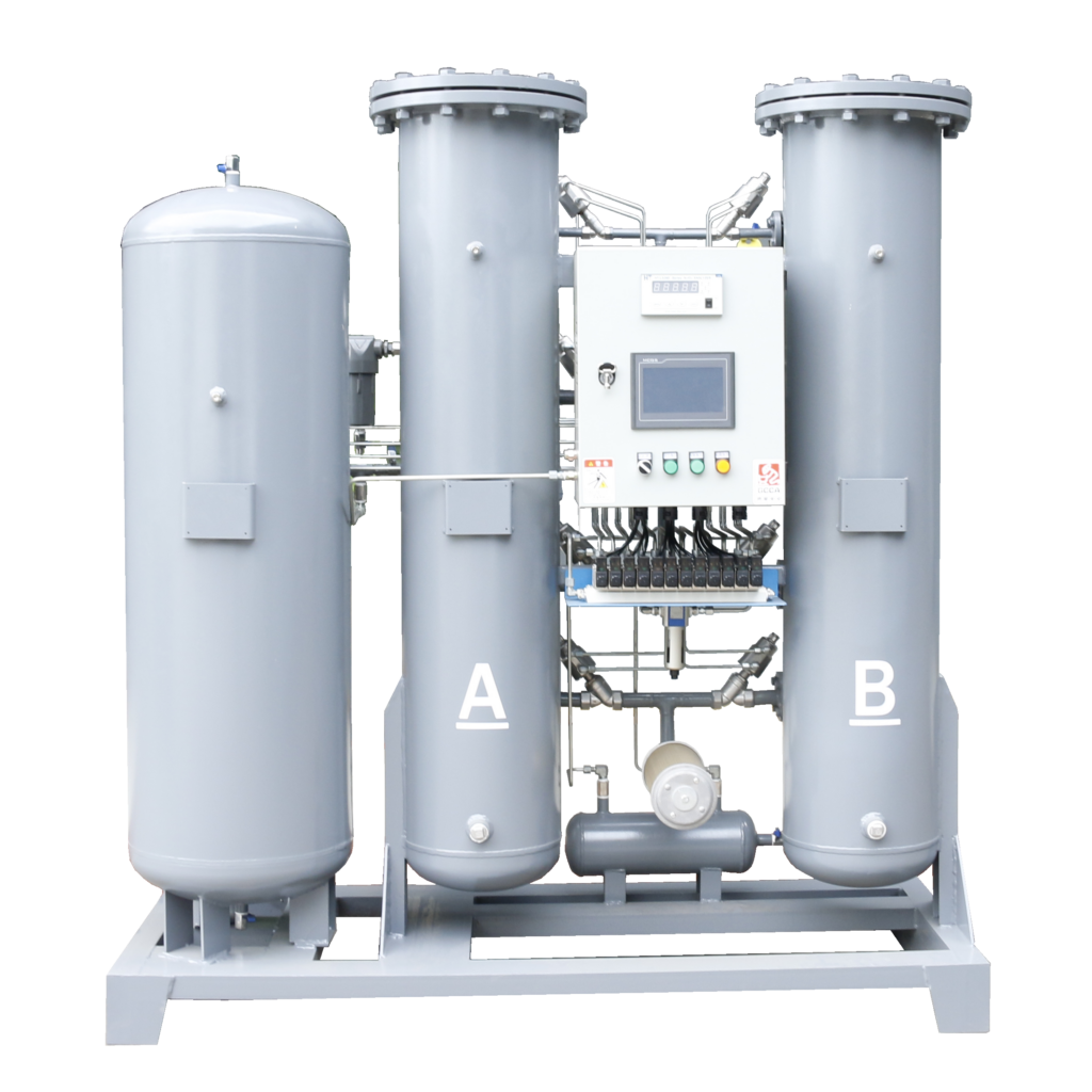 In this system, a specially designed adsorbent material selectively traps certain gases — like oxygen, moisture, and carbon dioxide — allowing nitrogen to pass through and be collected as the product gas.