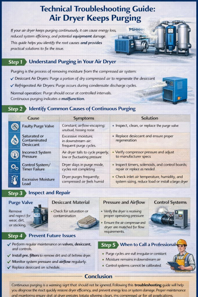 If your air dryer keeps purging continuously, it can cause energy loss, reduced system efficiency, and potential equipment damage. This guide helps you identify the root causes and provides practical solutions to fix the issue.
