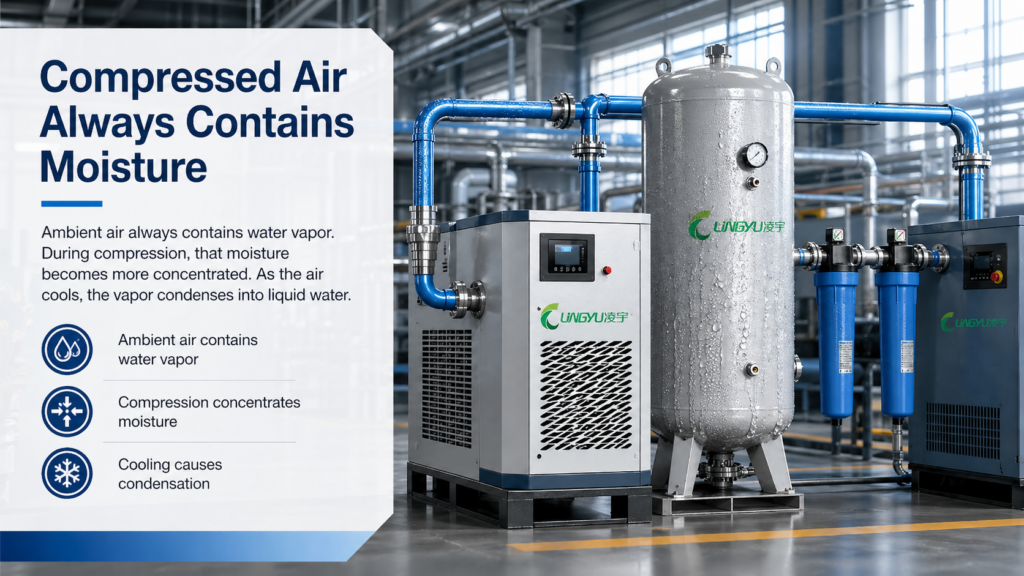 This is why the question is not whether compressed air contains moisture. It does. The real question is how to remove that moisture effectively.
