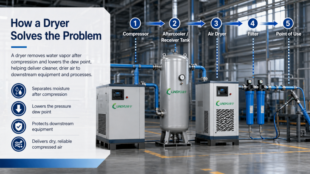 A dryer is needed because it lowers the dew point of compressed air. The dew point is the temperature at which water vapor condenses into liquid water. When the dew point is reduced, the air remains drier during storage, transmission, and use. This protects downstream equipment and supports stable operation.