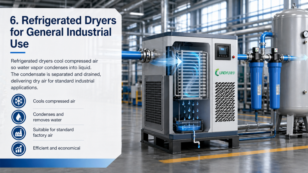 For many users asking why compressed air requires a dryer, a refrigerated dryer provides the most practical answer in standard production systems. It offers a good balance between drying performance, operating cost, and simplicity.