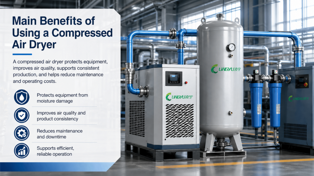 Many users focus only on the air compressor, but the performance of a compressed air system depends on all downstream components as well. A dryer helps protect the entire network, including air receivers, filters, piping, regulators, valves, actuators, tools, and end-use machines.